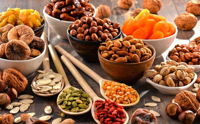 Các loại hạt như hạnh nhân, đậu phộng và quả óc chó là nguồn cung cấp canxi dồi dào cho bé. Hạnh nhân có chứa lên đến 228 mg canxi trên 100g. Các loại hạt này cũng chứa các chất béo lành mạnh, vitamin E, magiê và chất xơ. Khi cung cấp ở mức độ vừa phải, chúng cũng được coi là thực phẩm giàu canxi cho bé.