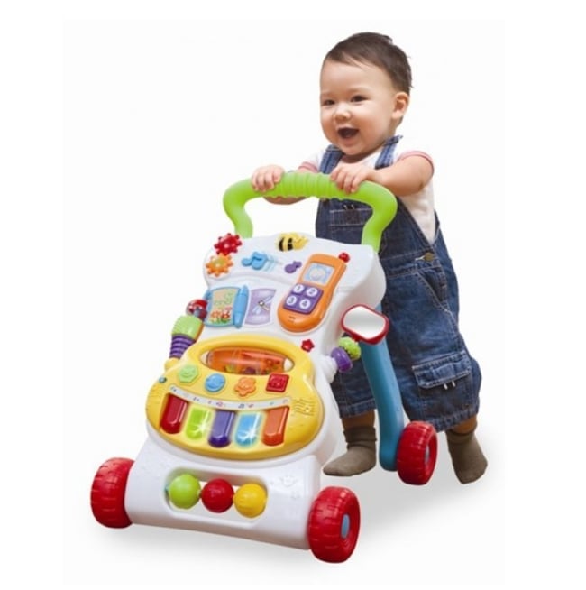 - Đồ chơi được tích hợp trên xe: điện thoại, bàn nhạc. Âm thanh vui nhộn sẽ được phát ra khi bé di chuyển.