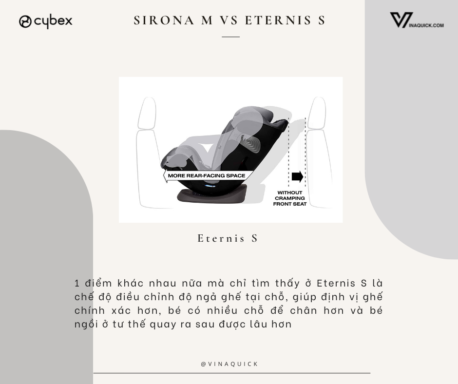 Eternis S còn có chế độ ngả ghế tại chỗ (In-seat recline) giúp định vị ghế chính xác hơn, không lo đập lên lưng ghế phía trước, bé có nhiều chỗ để chân hơn và có thể ngồi ở tư thế quay ra sau lâu hơn.