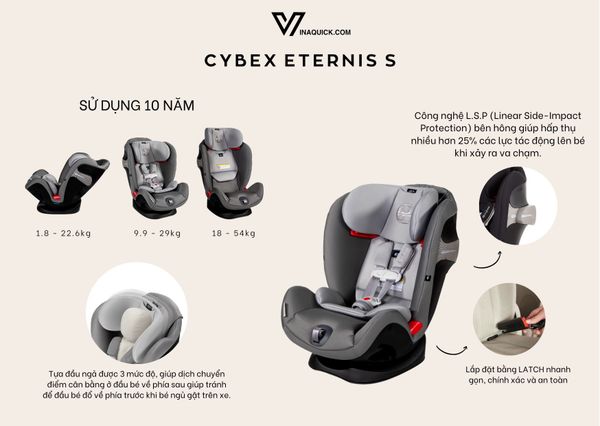 + Cybex Eternis S: Quay ra sau (1.8 - 22.6kg) và quay về phía trước (9.9 - 29kg) và booster seat (18 - 54kg).
