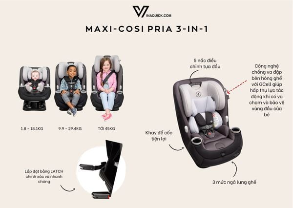 + Maxi-Cosi Pria 3-in-1: Quay ra sau (2.2 - 18.1kg), quay về phía trước (9.9 - 29.4kg) và booster seat (18.1 - 45kg).