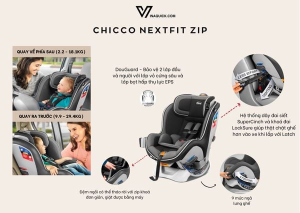 + Chicco NextFit Zip: Quay ra sau (2.2 - 18.1kg) và quay ra phía trước (9.9 - 29.4kg).
