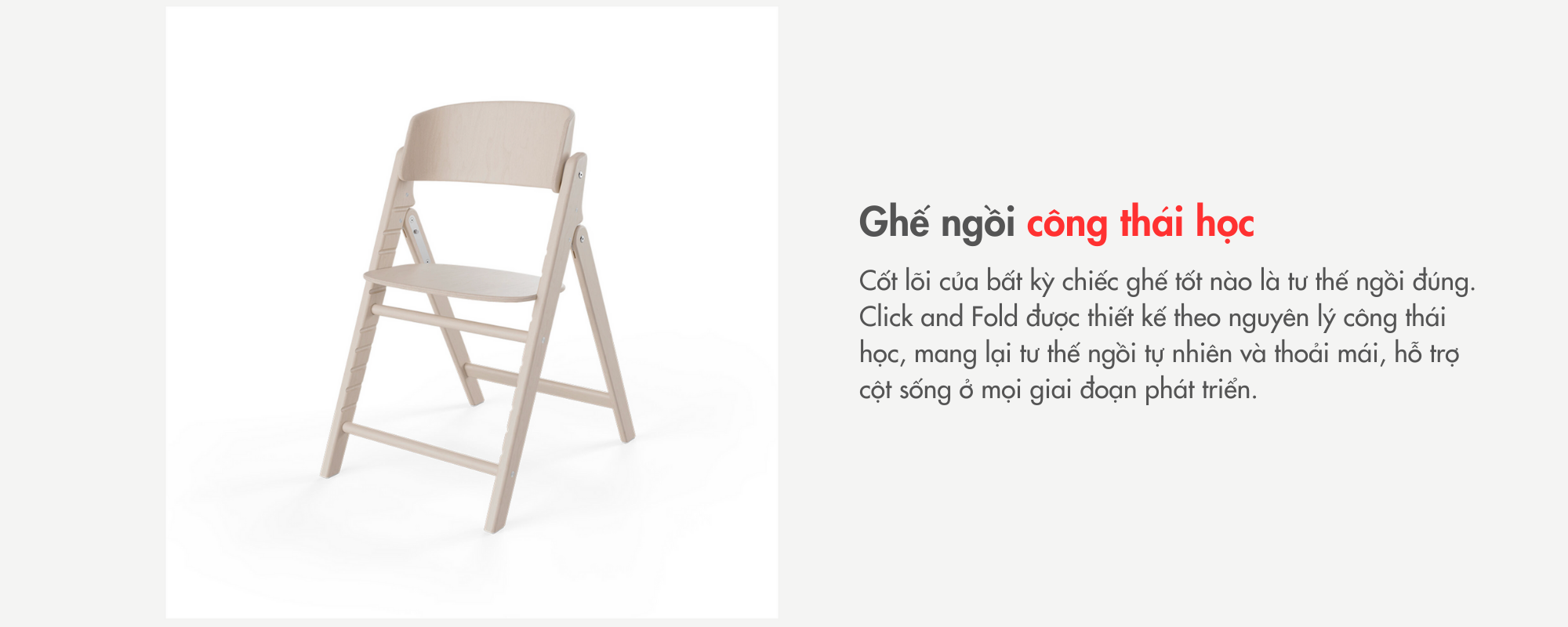 Điểm cốt lõi của chiếc ghế này nằm ở kỹ thuật thiết kế thông minh – có thể gấp gọn nhanh chóng để dễ dàng cất giữ hoặc mang theo. Tính công thái học và khả năng điều chỉnh linh hoạt giúp Click & Fold mang lại tư thế ngồi tự nhiên và tốt cho lưng từ 3 đến 99 tuổi.