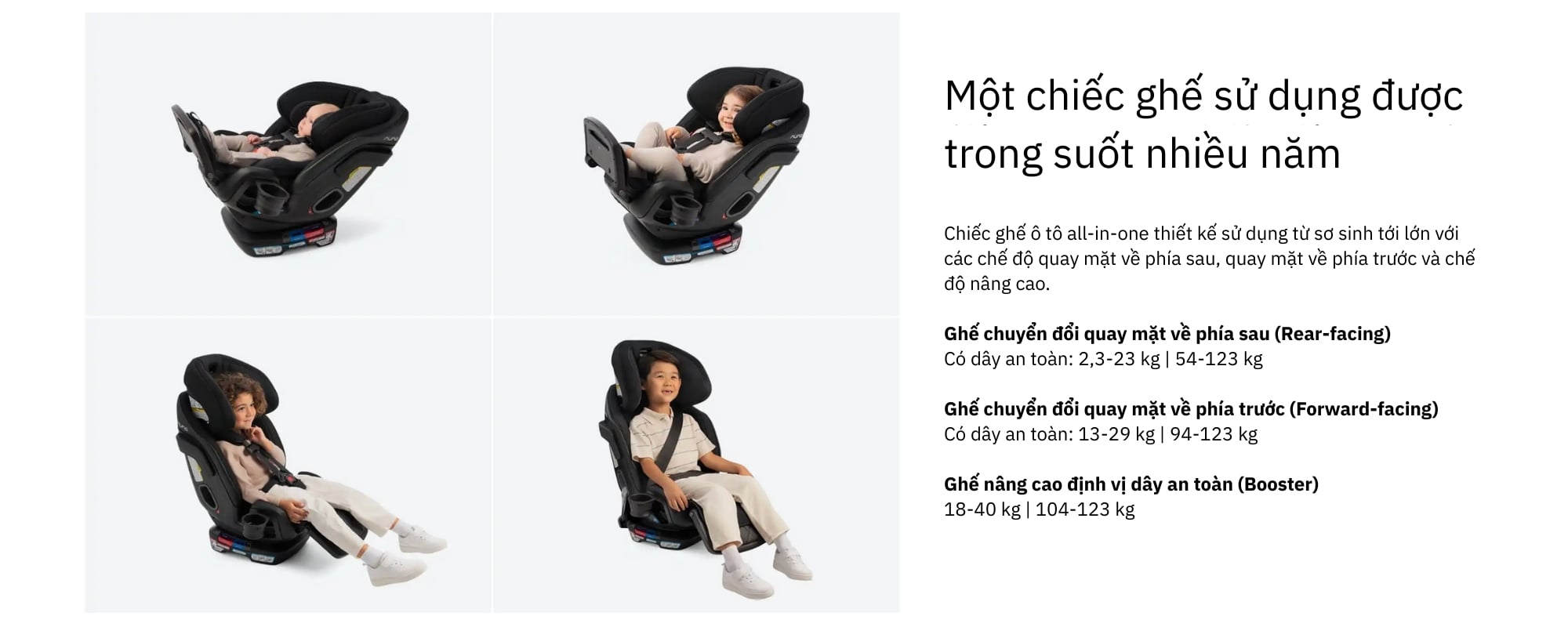 Ghế ô tô all-in-one chuyển đổi linh hoạt từ hướng sau → hướng trước → chế độ booster, đồng hành cùng bé qua mọi giai đoạn phát triển.