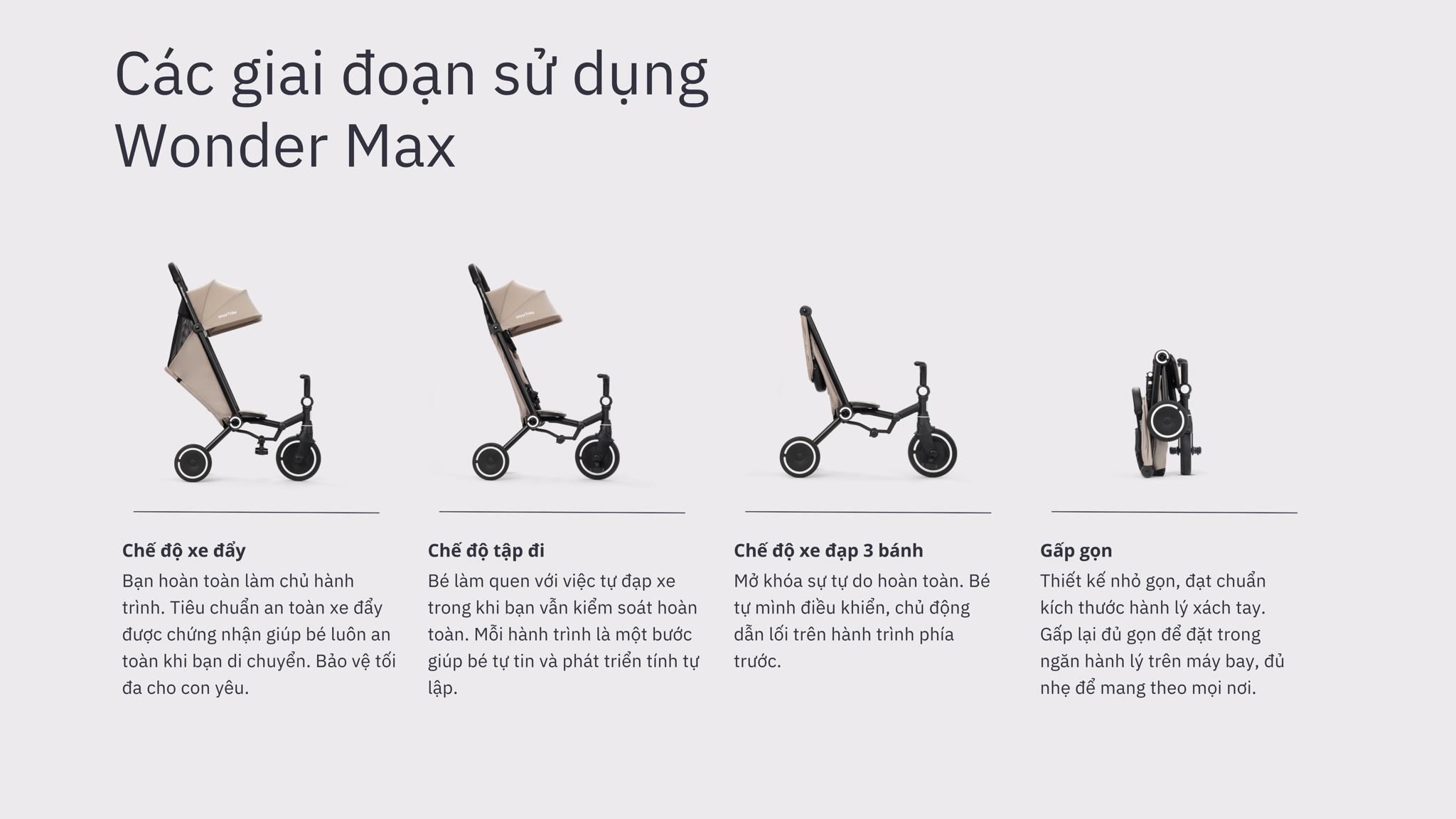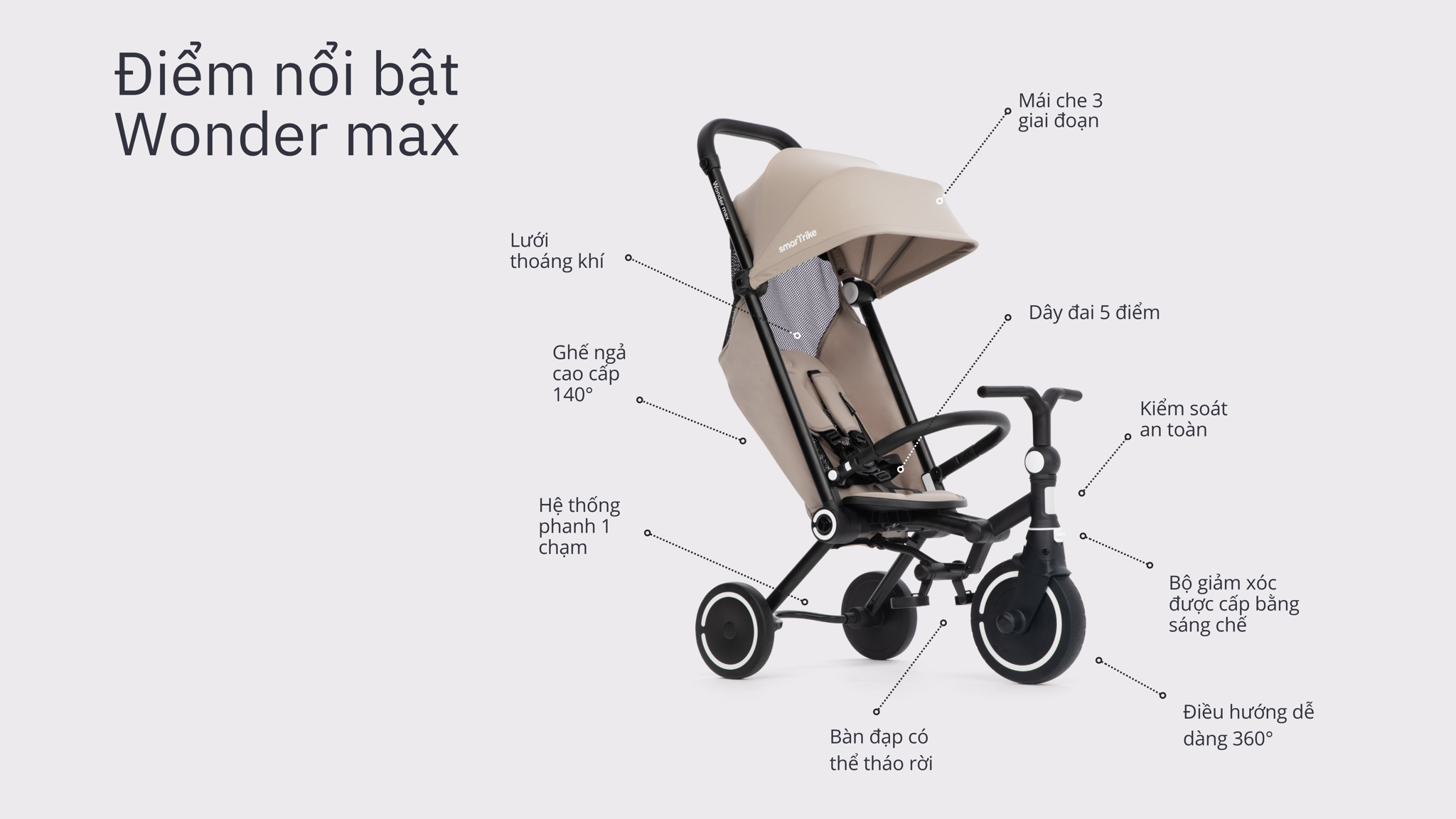Wonder Max mang đến những tính năng cao cấp và sự thoải mái tối đa cho mọi hành trình. Sản phẩm được trang bị ghế ngả 140°, chất liệu đệm êm ái cao cấp, hệ thống điều hướng 360° độc quyền cùng mái che 3 giai đoạn linh hoạt. Đạt chứng nhận tiêu chuẩn an toàn cho xe đẩy. Phù hợp cho bé từ 6 tháng đến 3 tuổi.